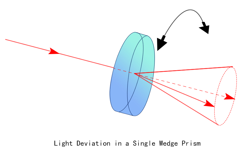 1. Wedge Prism could either be used as a single element or in pairs. Operating alone, wedge prisms could be used for beam steering, where the extent of angular deviation is often slight. ( See Figure 1. below). A single wedge prism might also be installed in a rotatable mount so that by rotating the wedge prism about the optical axis, a circle traced using the deviated beam could be formed.