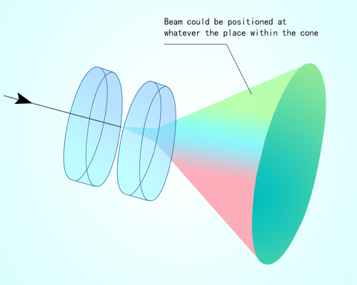 Wedge prisms could either be used as a single element or in pairs (in this case, the wedge prism pair could also be called a Risley Prism Pair). As mentioned above, a single wedge prism could be utilized to deviate a laser beam at a set angle or realize the tracing of a circular light path on the vertical plane. Wedge prisms in pairs can be used for anamorphic beam shaping (i. e. to correct the elliptical beams into circular ones in laser diodes). Besides, by spinning the two wedge prisms in conjunction at relative rotation speeds, one can attain an adjustable amount of light deflection, the exiting laser beam could be positioned in a random direction inside a cone that takes the incident beam as the center axis (i.e., laser scanning output with spontaneous beam profile are feasible). or, in other words, assume α is the light deviation from an individual wedge prism, a pair of Risley wedge prisms can steer a beam in whatever place within a circle defined as the angle 4α.